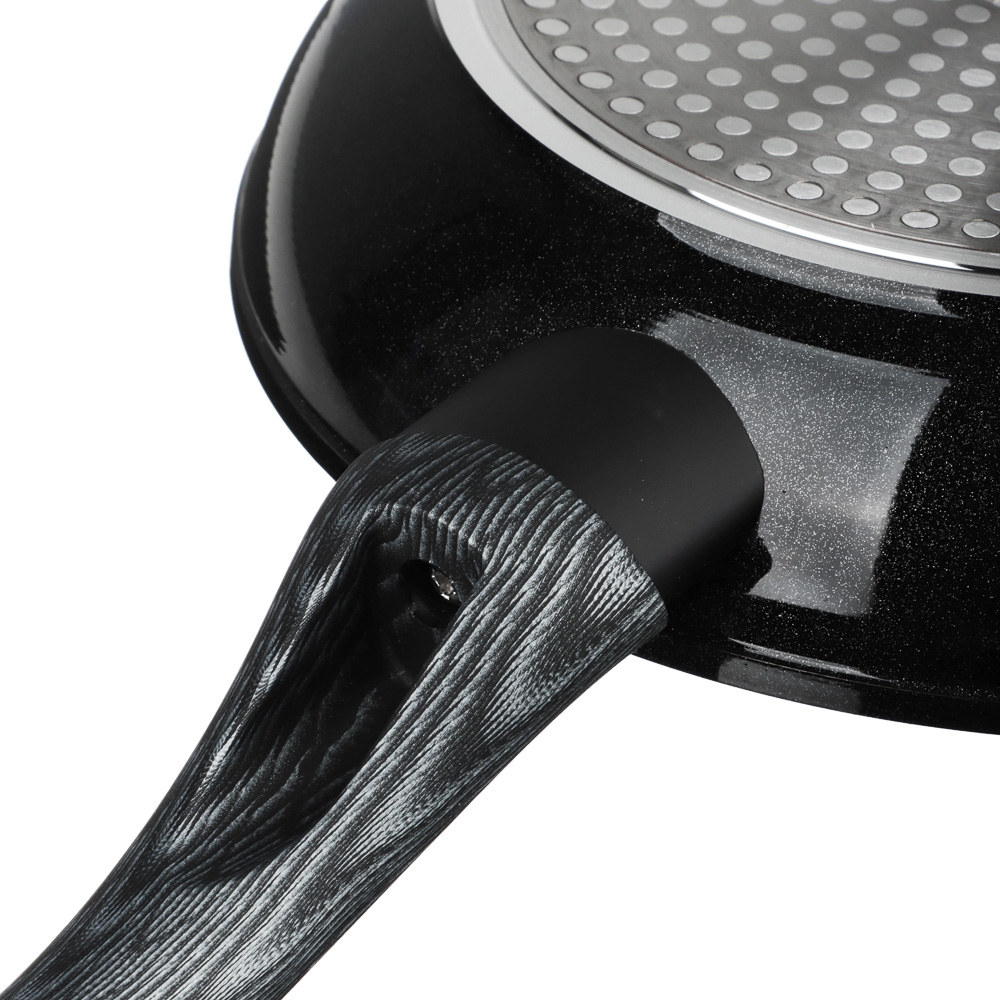 Отличительная особенность серии "Карбон" - это оригинальный графичный дизайн ручки черно-серого цвета. Сама ручка изготовлена из бакелита с силиконовым напылением, не нагревается и не скользит. Сковорода подходит для использования на всех видах плит, в том числе и индукционной плиты, а также для мытья в посудомоечной машине.