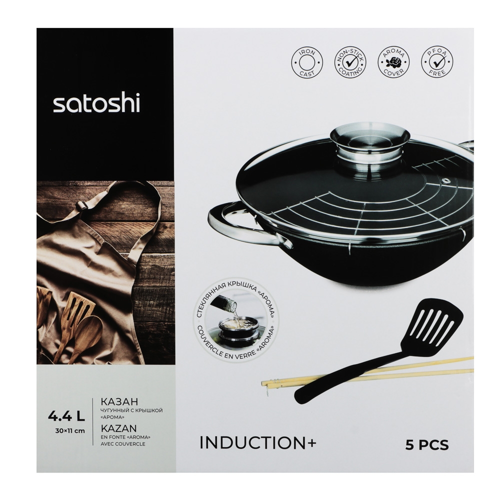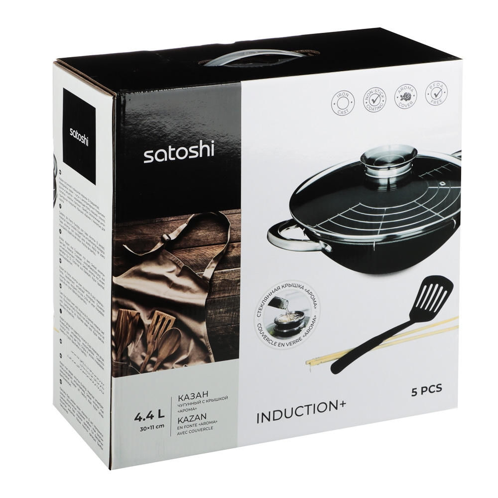 SATOSHI Казан чугун,30см,4,4л,антипр.покр, нерж.ручк,решетка,стекл.крыш,нейлон.лопатка,бамб.палочки