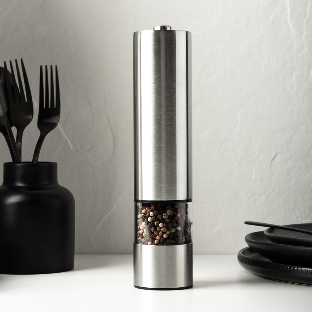 Мельница для специй SATOSHI отлично подходит для добавления в блюда свежемолотой соли или перца, измельченного перца чили, сушеного тимьяна и розмарина и т.п. Просто нажмите на кнопку — и через несколько секунд вы получите необходимое количество молотых приправ, которые придадут неповторимый вкус вашим блюдам. Для мельницы необходимы батарейки АА 4 шт.