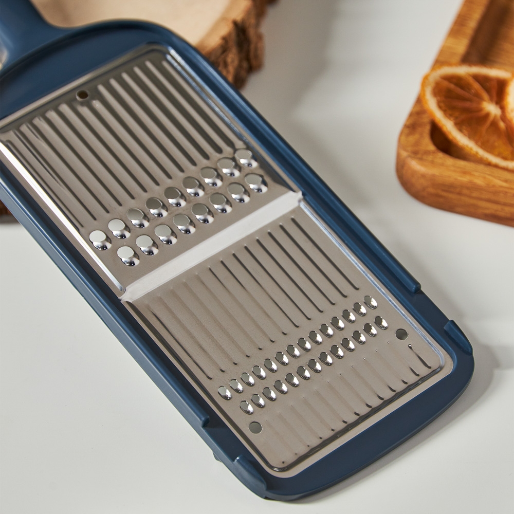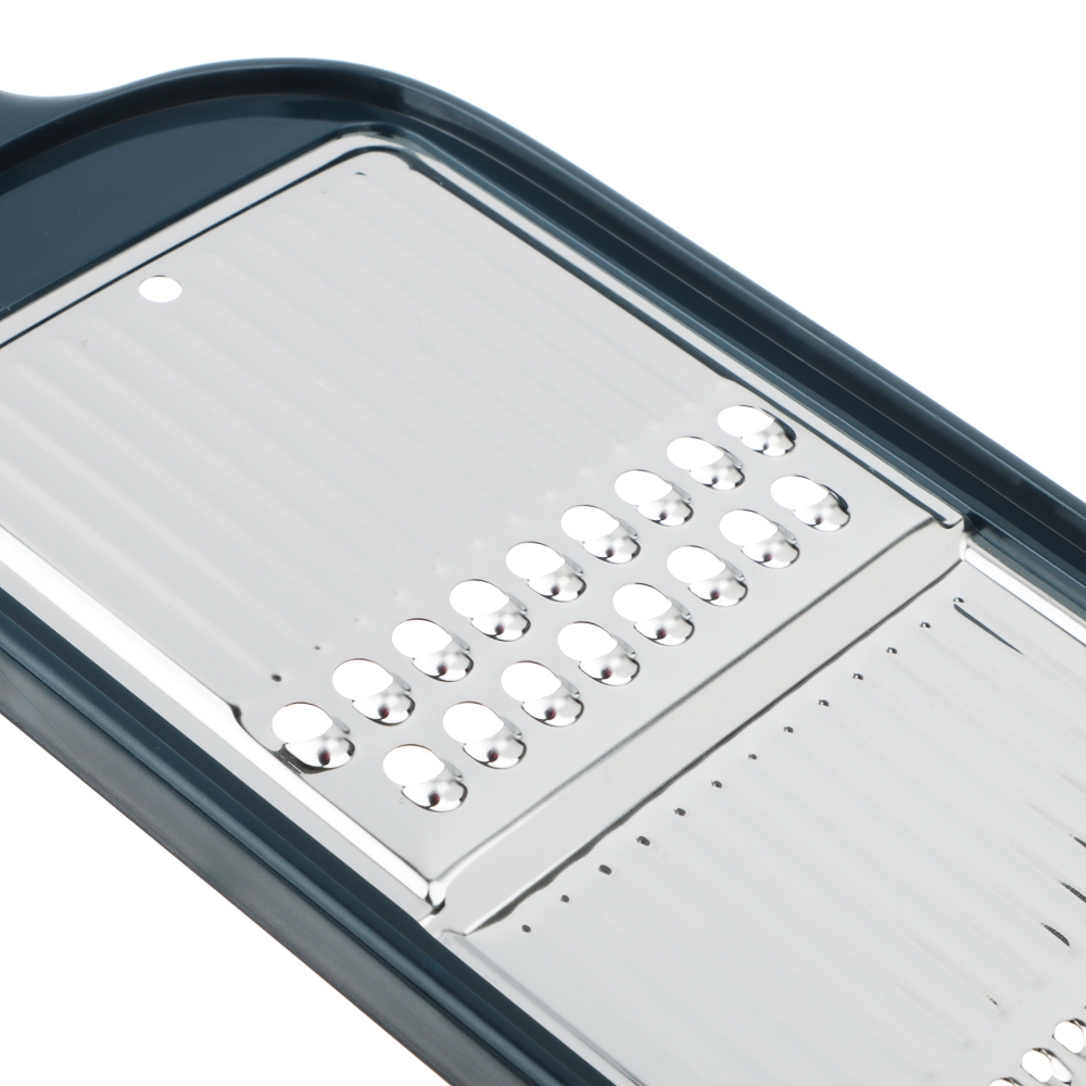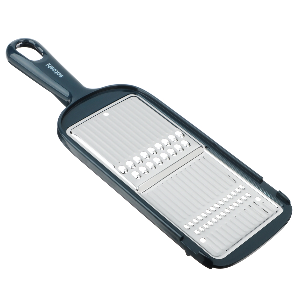 Терка плоская размером 28 см из нержавеющей стали с удобной ручкой. Имеет классический размер отверстий маленького диаметра. Идеальна для измельчения небольшого количества сыра, лимона, шоколада и прочих твёрдых продуктов.