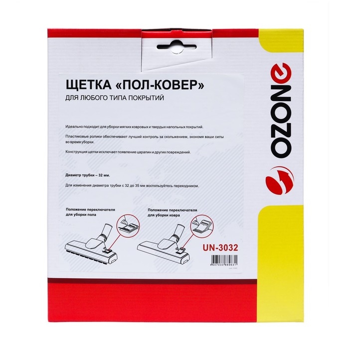 Щетка для пылесоса "Пол-ковер" UN-3032 Ozone - это универсальное решение для уборки любых видов покрытий. Она идеально подходит для чистки ковров, паркета, линолеума и других твердых поверхностей. Щетка оснащена специальными щетинками, которые эффективно удаляют пыль, волосы и другие загрязнения, обеспечивая глубокую и тщательную очистку.