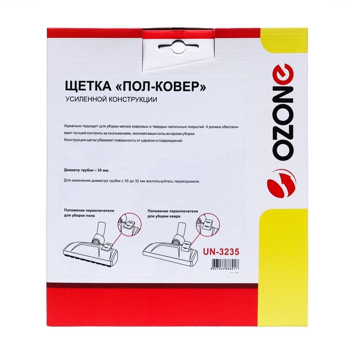 Щетка для пылесоса "Пол-ковер" UN-3235 Ozone - это усиленная конструкция, которая обеспечивает еще большую прочность и долговечность. Она идеально подходит для уборки любых видов покрытий, включая ковры, паркет, линолеум и другие твердые поверхности. Щетка оснащена специальными щетинками, которые эффективно удаляют пыль, волосы и другие загрязнения, обеспечивая глубокую и тщательную очистку.