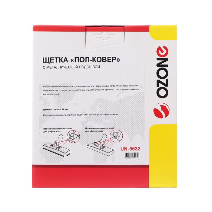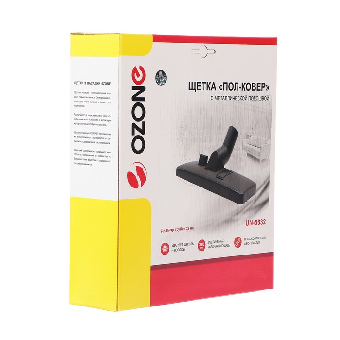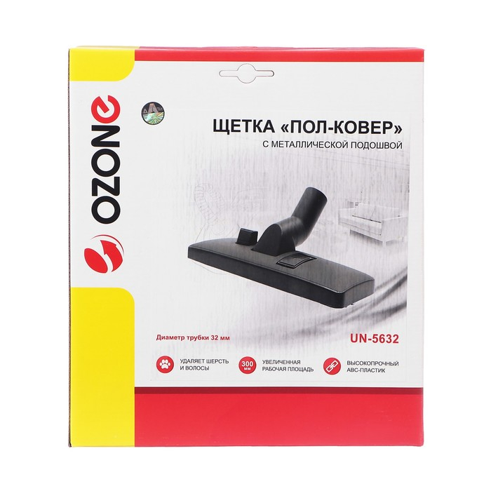 Щетка для пылесоса "Пол-ковер" Ozone с металлической подошвой - это универсальный аксессуар, который позволяет эффективно очищать как твердые, так и ковровые покрытия. Она имеет ширину 300 мм, что обеспечивает большую площадь уборки за один проход.