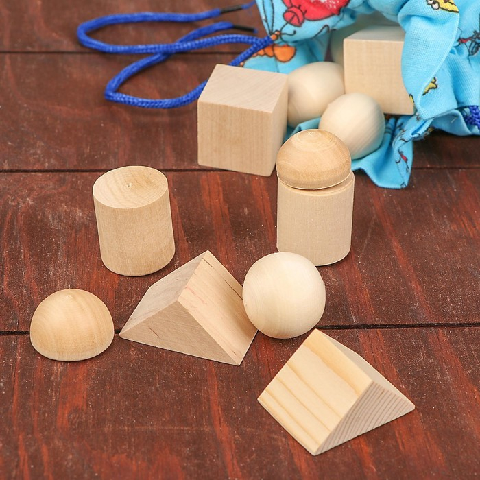 - Формы фигур в наборе: куб, треугольник, усечённый конус, цилиндр, яйцо, шар и половина шара.