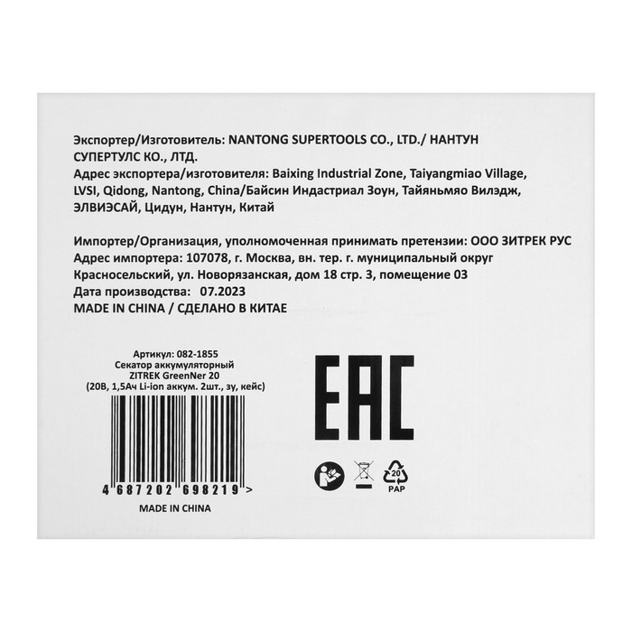 Секатор аккумуляторный ZITREK GreenNer 20, 20 В, 2х1.5 Ач, Li-ion, кейс