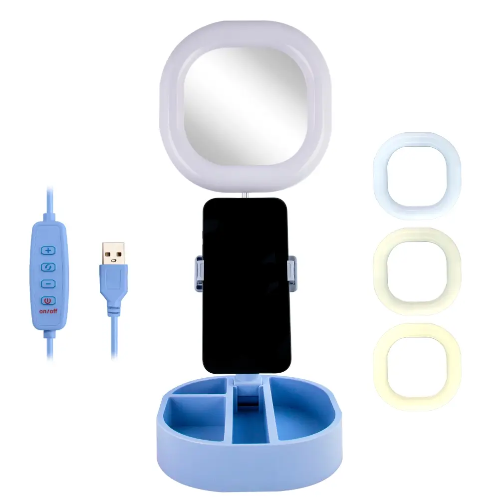 Комплектация: селфи лампа, кабель питания, зажимное крепление и держатель для телефона