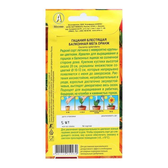 Семена Цветов Гацания "Балконная мега оранж", 4 шт