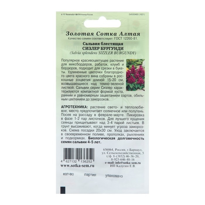Семена цветов Сальвия "Акварель", Сем. Алт, ц/п, 0,1 г