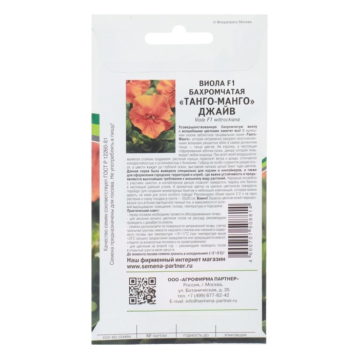 Семена цветов Виола бахромчатая "Танго-Манго Джайв F1", 10 шт
