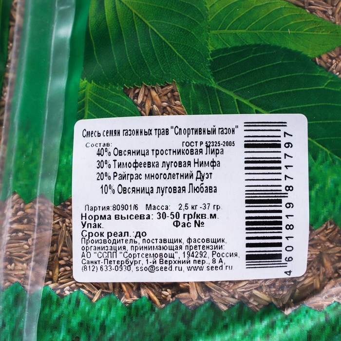 Семена газонной травы "Зеленый уголок","Спортивный", 2,5 кг