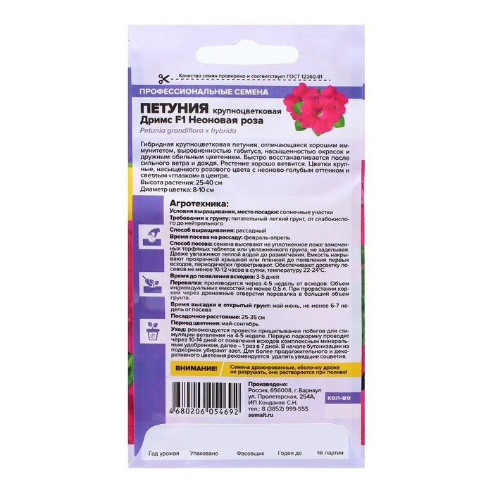 Гибридная крупноцветковая петуния, отличающаяся хорошим иммунитетом, выровненностью габитуса, насыщенностью окрасок и дружным обильным цветением. Быстро восстанавливается после сильного ветра и дождя. Растение хорошо ветвится. Цветки крупные, насыщенного розового цвета с неоново-голубым оттенком и светлым «глазком» в центре. Высота растения: 25-40 см Диаметр цветка: 8-10 см. Время до появления всходов: 3-5 дней Перевалка: производится через 4-5 недели от всходов. Объем индивидуальных емкостей не менее 0,5 л. При прорастании корней через дренажные отверстия перевалка в больший объем грунта Время высадки в открытый грунт: май-июнь, не менее 6-7 недель от посева Посадочное расстояние: 25-35 см Период цветения: май-сентябрь Уход: рекомендуется провести прищипывание побегов для стимуляции ветвления на 4-5 неделе. Первую подкормку проводят через 10-14 дней от появления всходов комплексным минеральным удобрением, далее – 1 раз в 7 дней. В начале бутонизации из подкормок убирают азот. Для более продолжительного и декоративного цветения рекомендуется удалять увядшие соцветия. Внимание! Семена дражированные, оболочку драже не разрушать, она растворяется при поливе!
