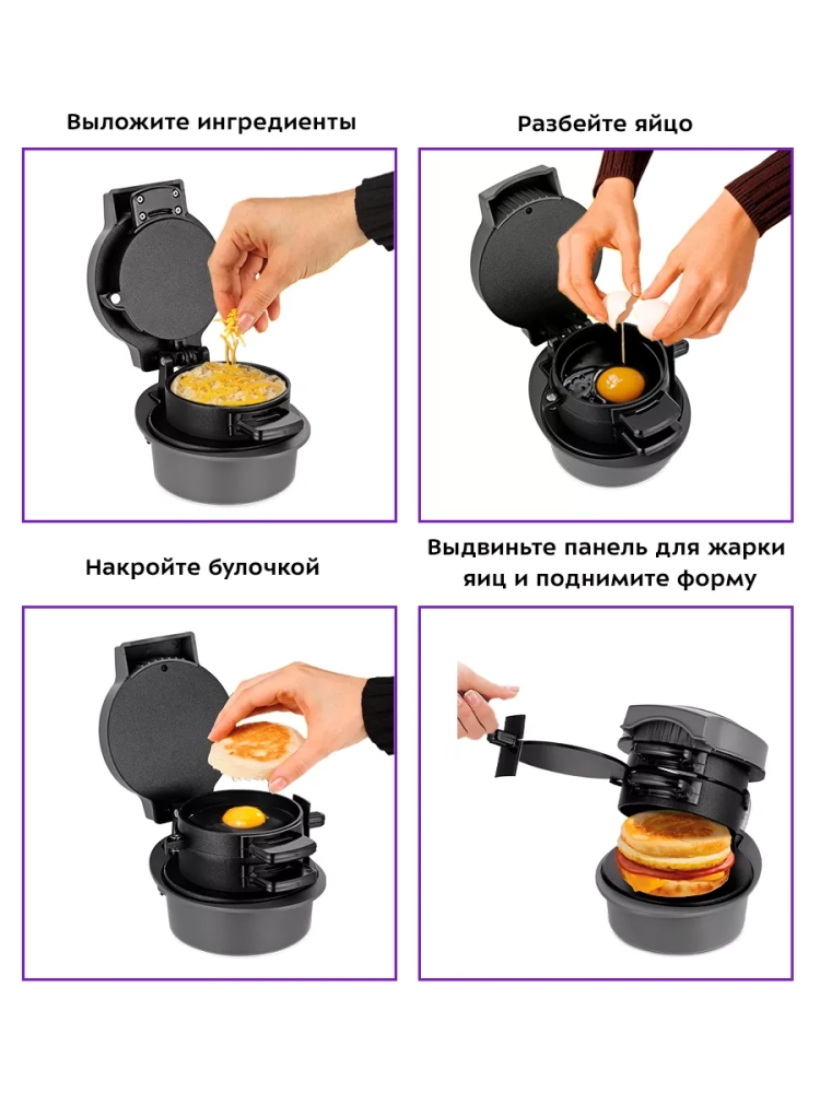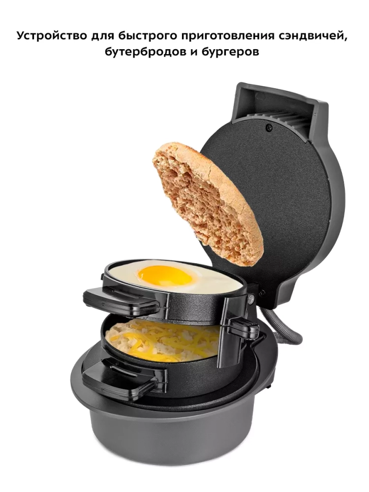Конструкция устройства предусматривает приготовление сэндвича с закрытой крышкой в форме для сэндвича. При таком приготовлении продукты, находящиеся в форме для сэндвича, готовятся со всех сторон. Приготовление блюд таким способом позволяет им быстрее готовиться и не требует от вас переворачивать еду в процессе приготовления.