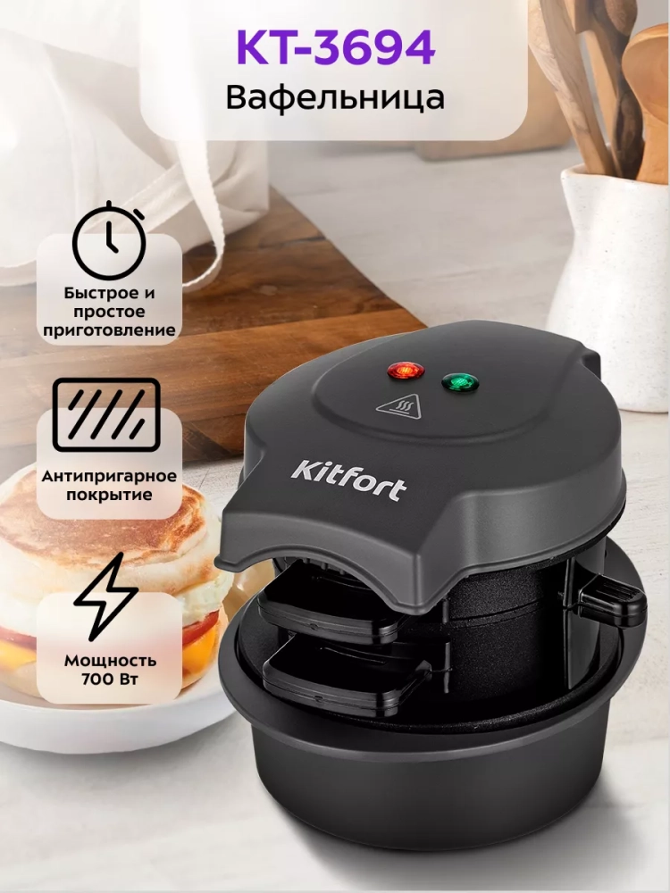 Сэндвичмейкер Kitfort KT-3694 поможет приготовить самые разнообразные сэндвичи. В устройстве можно готовить не только привычные сэндвичи с ветчиной и сыром, но и сладкие бутерброды, например, с яблоками и творогом. Если использовать булочку для бургера и готовую котлету, то вы сможете быстро и просто приготовить бургер. Одним из ингредиентов сэндвича может стать глазунья или омлет, приготовленный непосредственно в сэндвичмейкере. Сэндвичмейкер предназначен для приготовления одного сэндвича за раз.