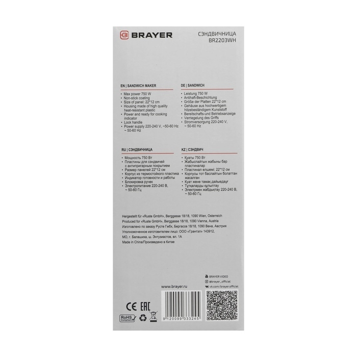 Сэндвичница BRAYER 2203BR-WH, 750 Вт, пластины с антипригарным покрытием, 22х12 см