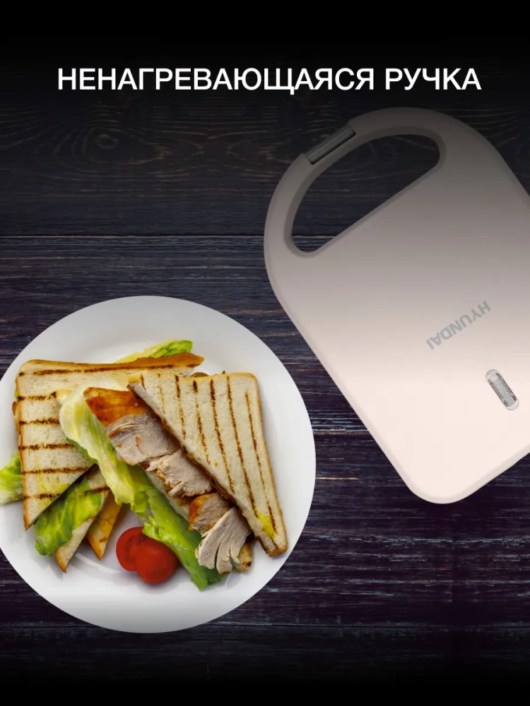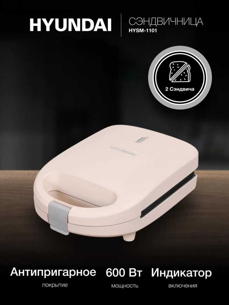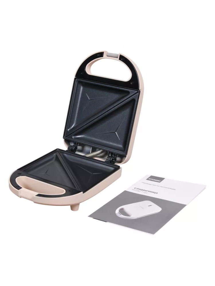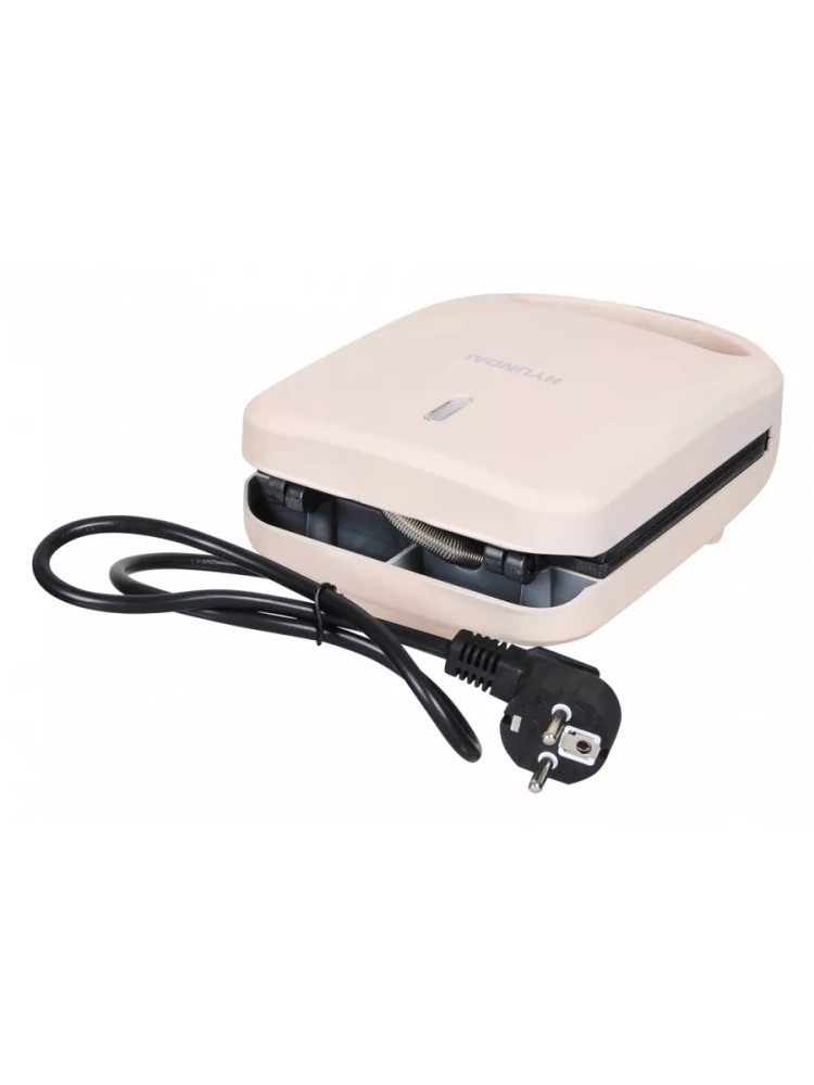 Сэндвичница Hyundai HYSM-1101 бежевый, мощность 600Вт, формы для готовки: пластины для сендвичей. Замок фиксации закрытия крышки, Антипригарное покрытие нагревательных частей