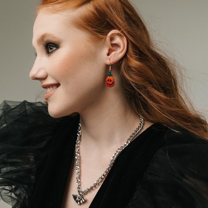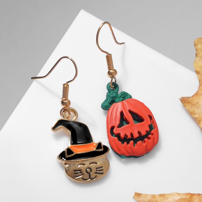 Серьги эмаль «Тыква» и котик в шляпе, цветные в золоте