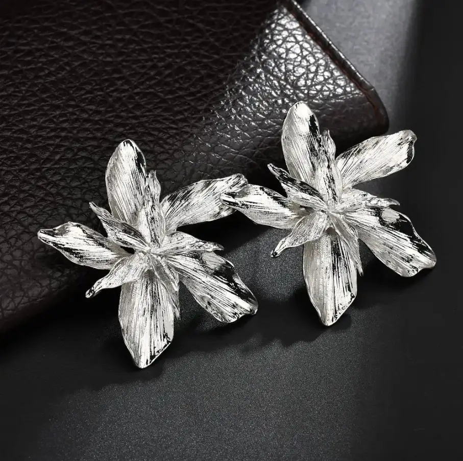 Серьги крупные цветы бижутерия серебристые