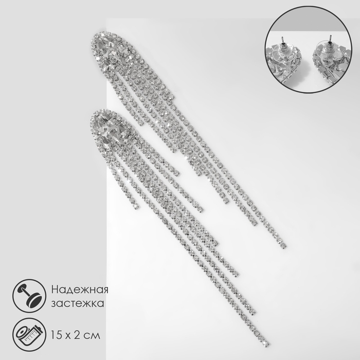 Серьги висячие со стразами «Голливуд» нити на кристаллах, цвет белый в серебре, 15 см