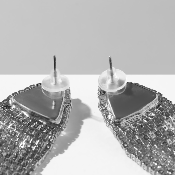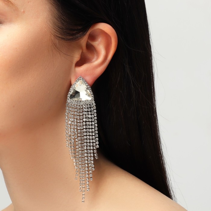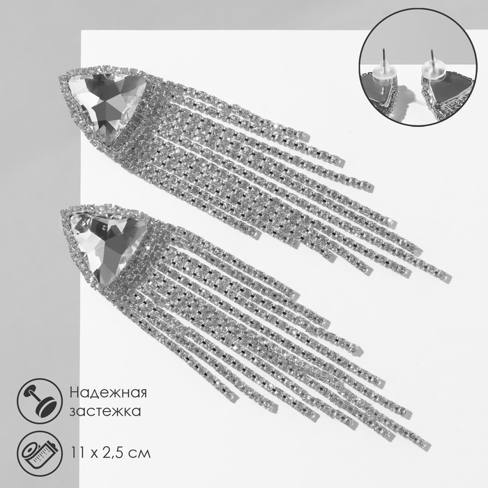 Серьги висячие со стразами «Грация» крупный треугольник, цвет белый в серебре, 11 см