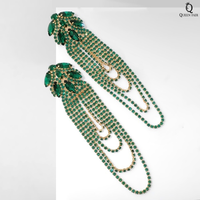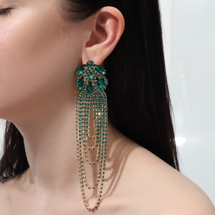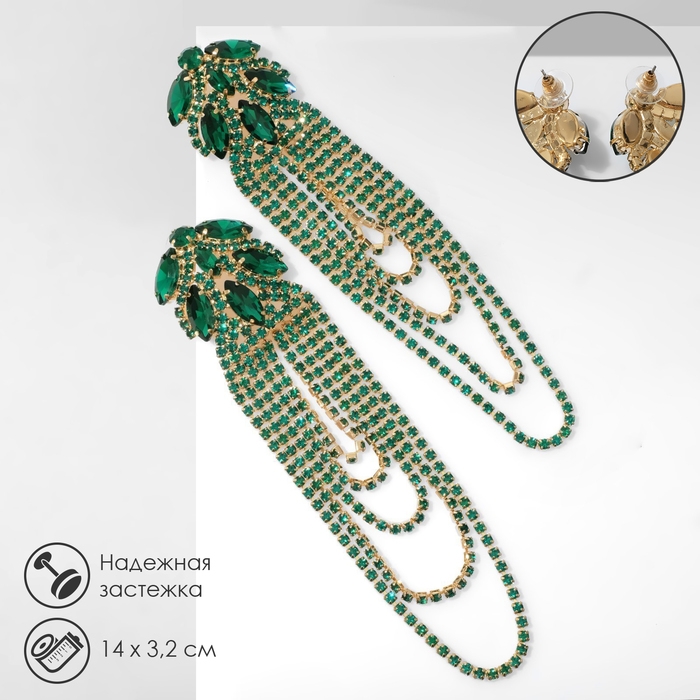 Серьги висячие со стразами «Мэджик» капли и водопад, цвет зелёный в золоте, 14 см
