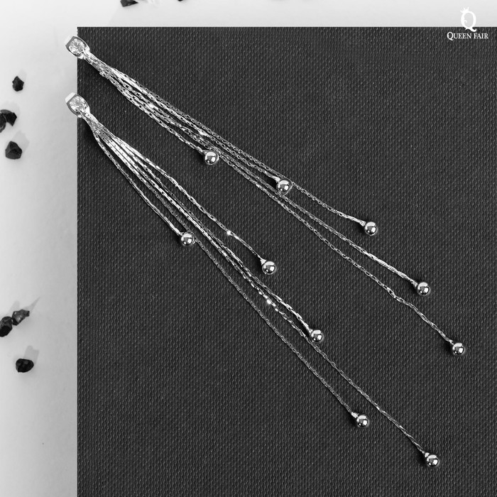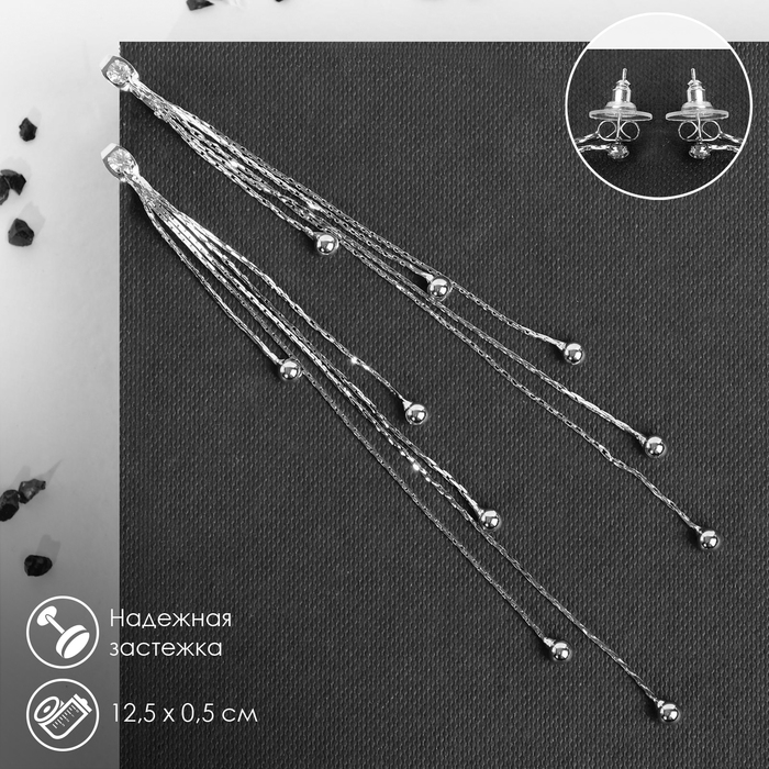 Серьги висячие со стразами «Селебрити» нити с бусинами, цвет белый в серебре, 12,5 см