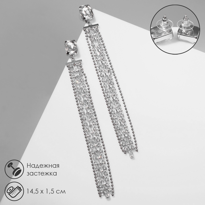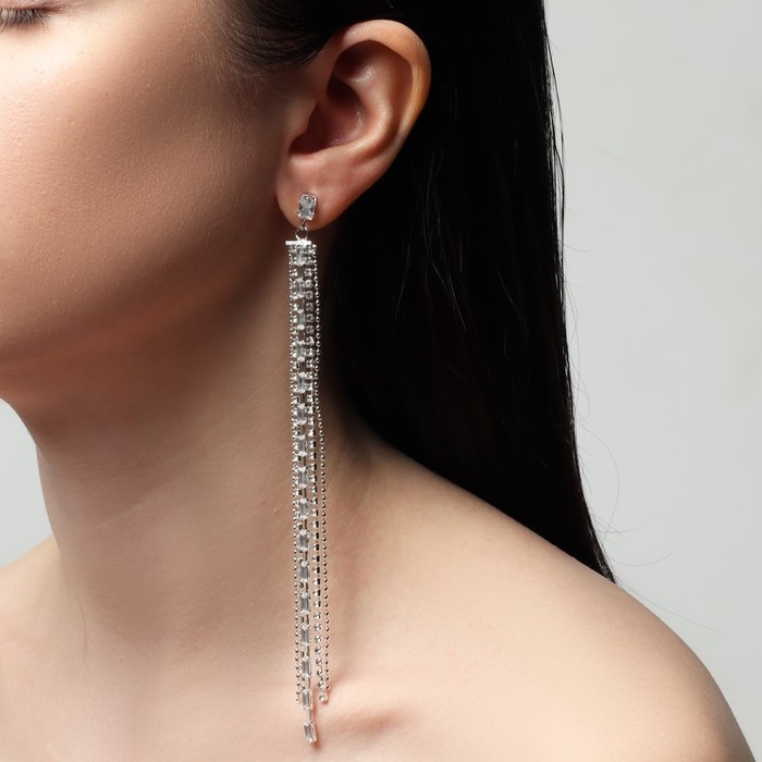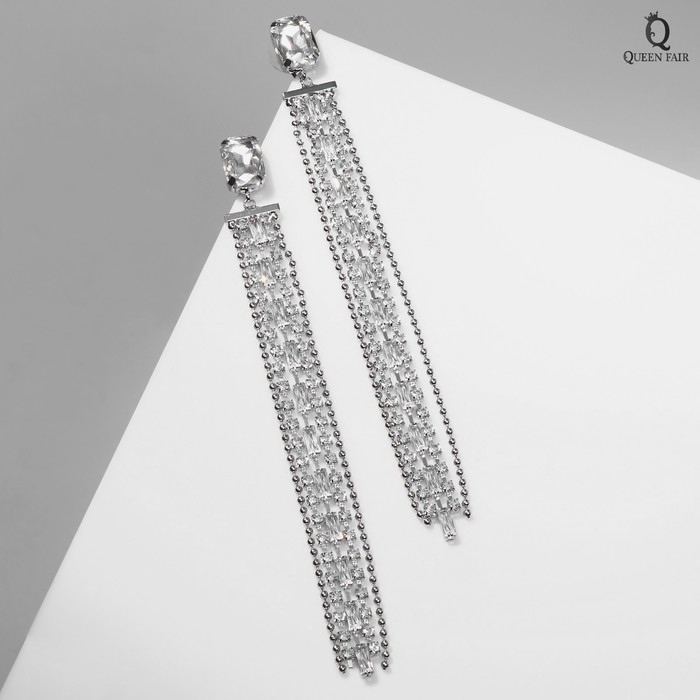Серьги висячие со стразами «Водопад» дама, цвет белый в серебре, 14,5 см