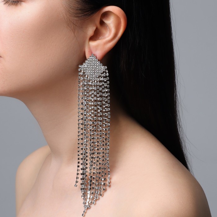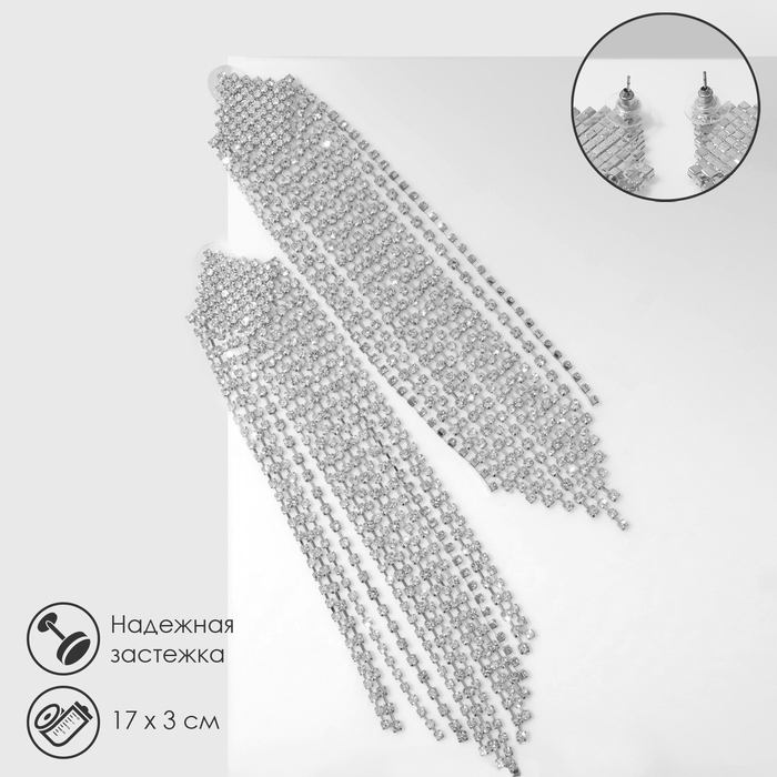 Серьги висячие со стразами «Водопад» ромбы, цвет белый в серебре, 17 см
