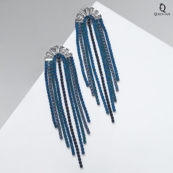 Серьги висячие со стразами «Водопад» веер, цвет синий в сером металле, 9,5 см
