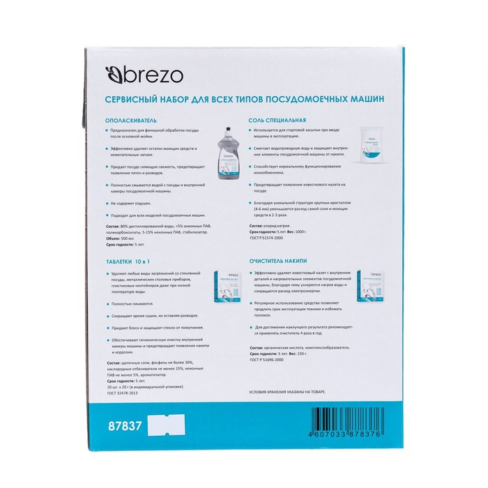 Сервисный набор для посудомоечной машины BREZO 87837 в нем есть все необходимое для комфортного использования посудомоечной машины: таблетки ALL in 1 для мытья посуды, очиститель накипи, ополаскиватель для финишной обработки и крупнокристаллическая соль.