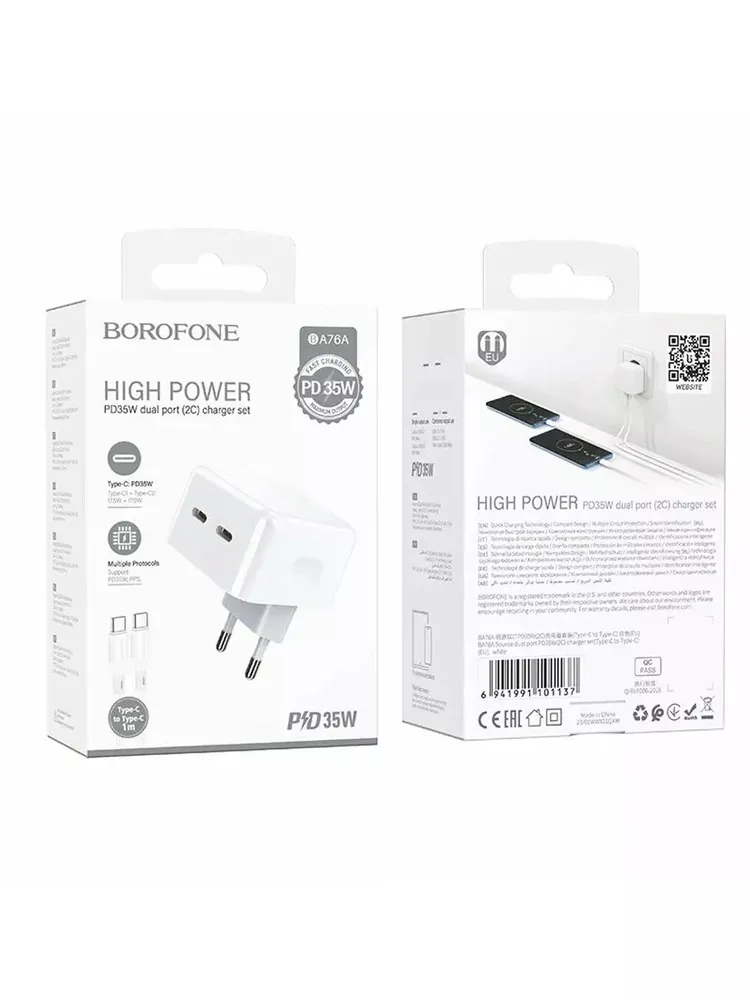 BOROFONE BA76A - это универсальное сетевое зарядное устройство с двумя выходами Type-C (USB-C) и общей мощностью 35 Вт.