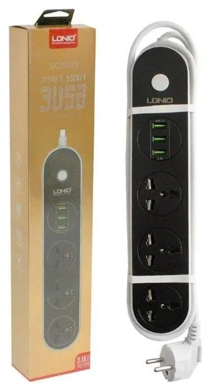 Сетевой удлинитель на четыре розетки и с тремя разъемами USB. Относится к разряду вещей, которые необходимо иметь дома и на работе, с его помощью можно безопасно запитать электроприборы, а также зарядить аккумуляторы мобильных устройств или обеспечить работу гаджетов от разъема USB. Три USB разъема обладают интеллектуальной функцией определения характеристик аккумулятора у подключенных устройств, в зависимости от которых регулируется подача тока. Данный факт обеспечивает эффективную и быструю зарядку подключенных устройств. Четыре евророзетки с заземлением, повернутые вокруг своей оси на 45 градусов, дают возможность одновременно запитать четыре электроприбора с суммарной, потребляемой мощностью до 2500 Вт при 10 А.