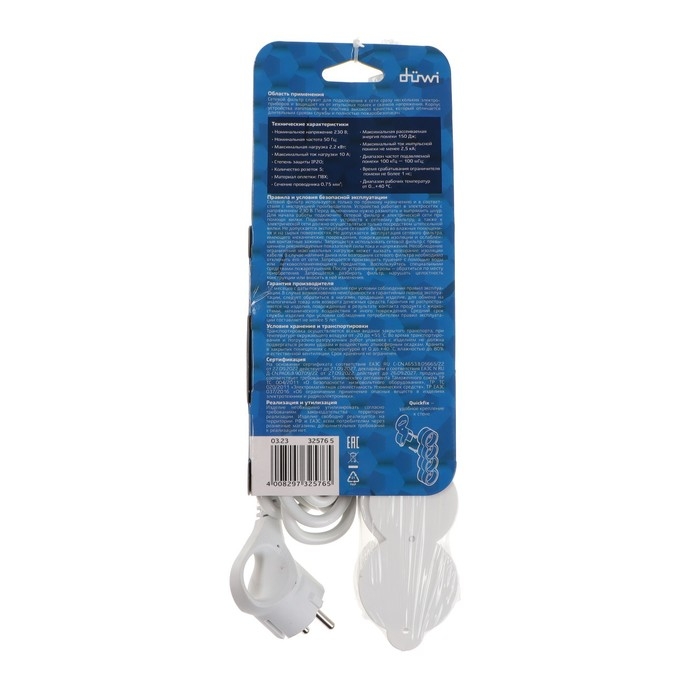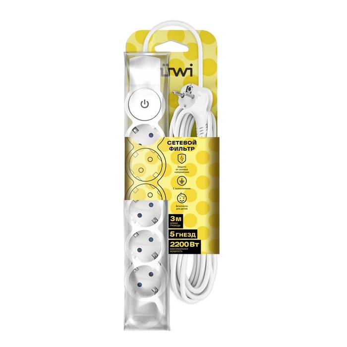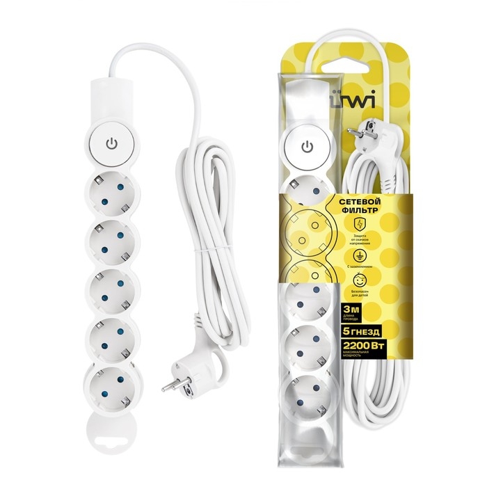 Сетевой фильтр, 5 гнезд, 3м, с/з, со шторками, с выкл, 2200Вт, 10А, бел, 32576 5, duwi