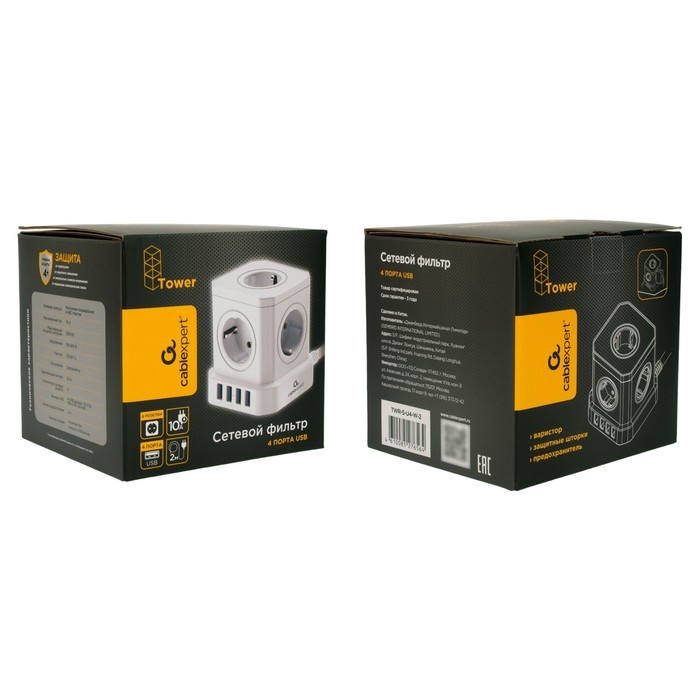 Сетевой фильтр Cablexpert Tower TWR-5-U4-W-2, 5р, 10А, 4хUSB, 3.1А, 2м, ур.защиты 4+, белый, 1030905