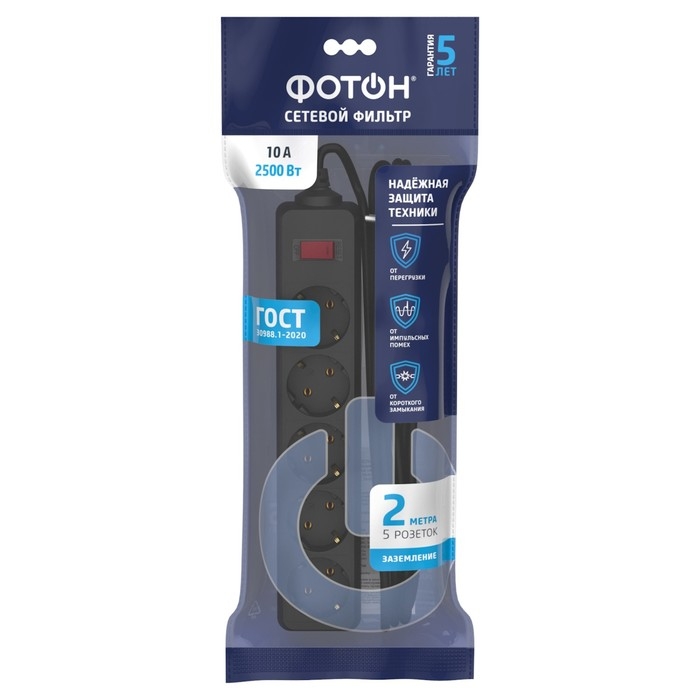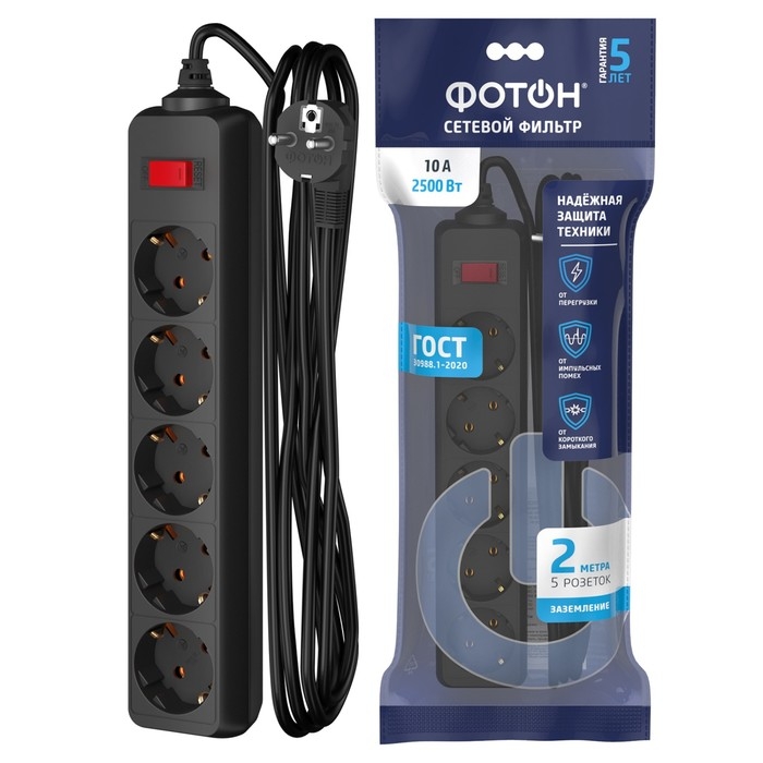 Сетевой фильтр "ФОТОН" SP 10-25ES, 2 м, 5 розеток, 10 А, с выкл, с з/к, черный