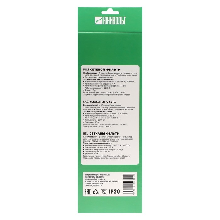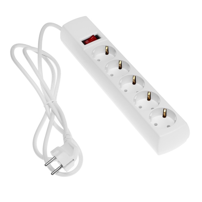 Сетевой фильтр Юнивольт, 5 гнезд, 1.5 м, 10 А, 2200 Вт, с з/к, белый