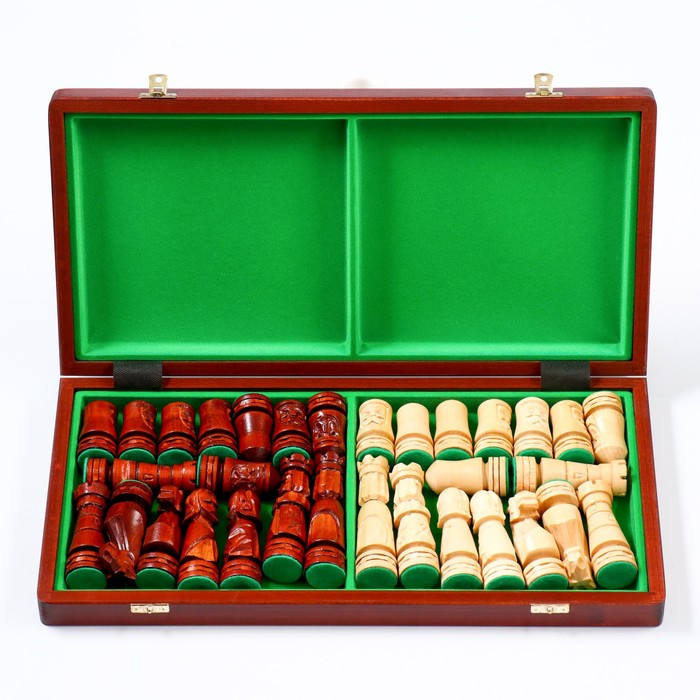Наличие бархата зеленого цвета добавляет изыска изделию, а для удобного хранения шахматных фигур предусмотрены специальные отсеки, что обусловливает минимум передвижения при переноске.