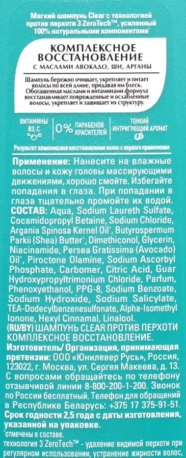 Шампунь для волос CLEAR Комплексное восстановление, против перхоти, 400мл