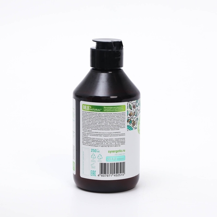 Натуральный бессульфатный шампунь SYNERGETIC "Интенсивное увлажнение и блеск" - эффективное средство для очищения кожи головы и всех типов волос. Шампунь обеспечивает деликатное очищение, эффективный уход за волосами и защиту кожу головы. Формула с гиалуроновой кислотой оказывает комплексное воздействие, эффективно увлажняет волосы и придает им здоровое сияние, не утяжеляя их. Комплекс масел миндаля, арганы и конопли оказывает восстанавливающее действие. Инновационные компоненты шампуня укрепляют волосы и стимулируют восстановление кератиновых волокон. Сок алоэ вера и экстракт мелиссы придают волосам эластичность и блеск. Мультифункциональный компонент натурального происхождения софоролипид мягко очищает кожу головы и сохраняет естественный микробиом. Нанести небольшое количество шампуня на влажные волосы, хорошо вспенить и тщательно смыть водой. При необходимости повторить процедуру. Возможно появление естественного осадка натурального происхождения и незначительное изменение цвета шампуня, не влияющие на его качество и свойства. При попадании мыла в глаза промыть их чистой водой. Sodium Palmate, Sodium Palm Kernelate, Aqua, Glycerin, Parfum, Sodium Chloride, Trisodium Dicarboxymethyl Alaninate, Tetrasodium Glutamate Diacetate, Butyrospermum Parkii Butter, Rosmarinus Officinalis Leaf Oil, Panthenol.