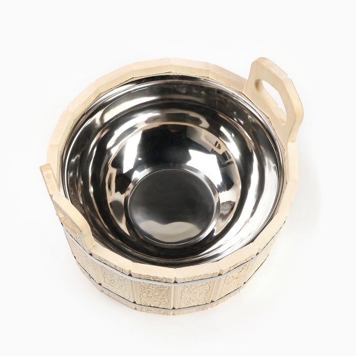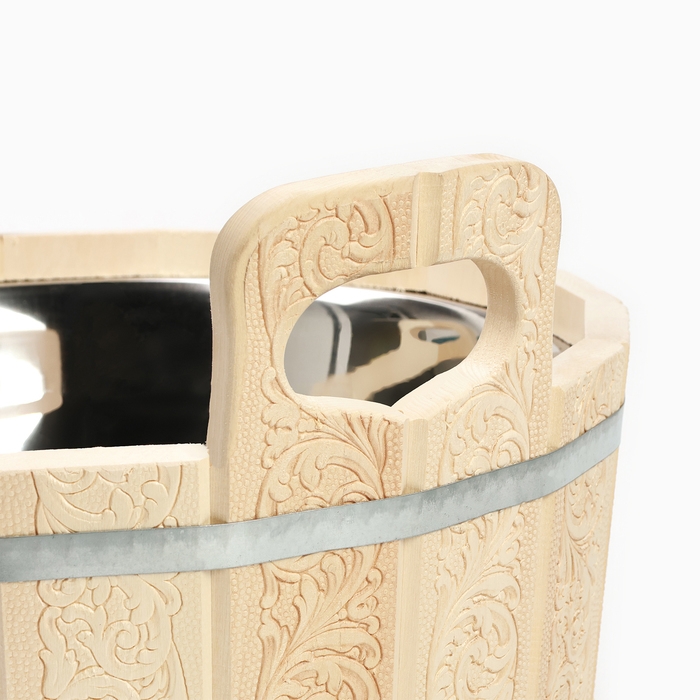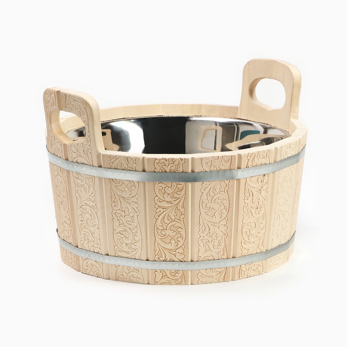 Шайка-таз из липы, 9 л, двуручная,нержавеющая вставка, "Русский узор"