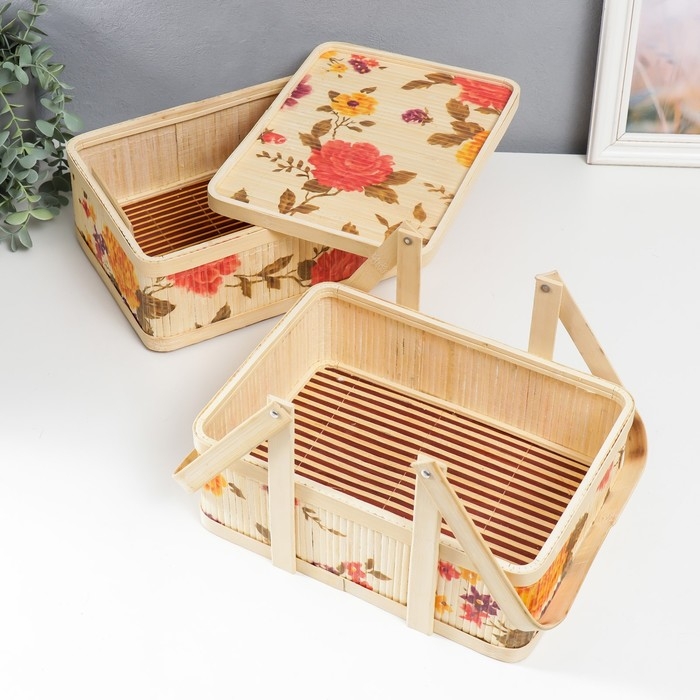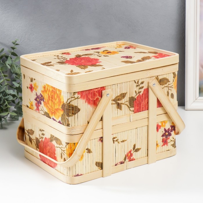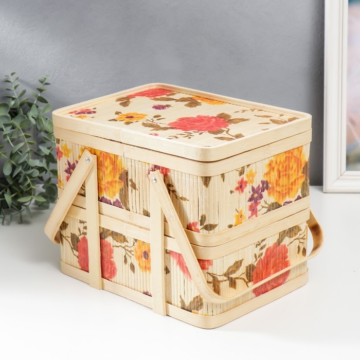 Шкатулка бамбук 2в1 "Сад с пионами" с ручками 21х20х27 см