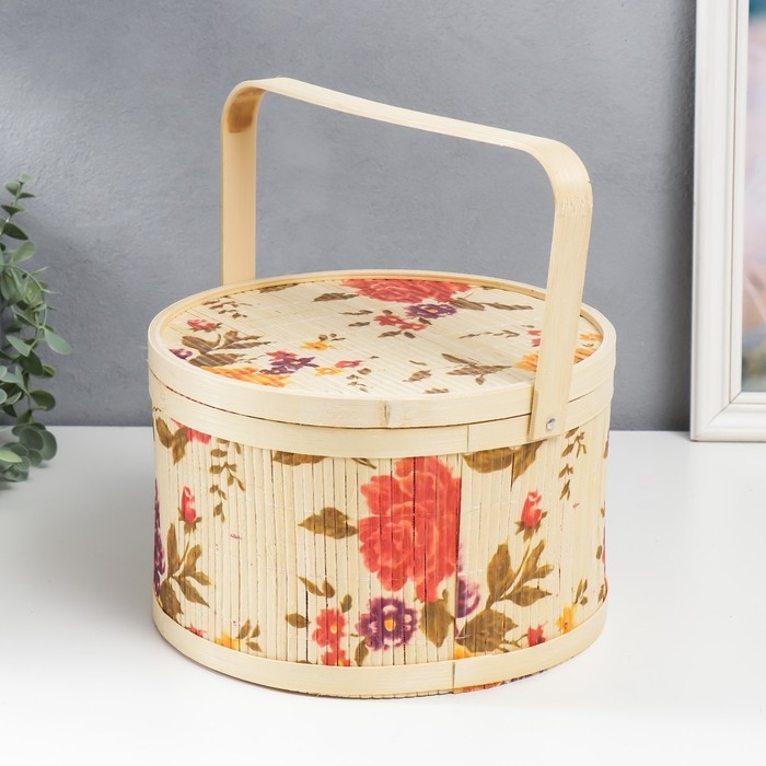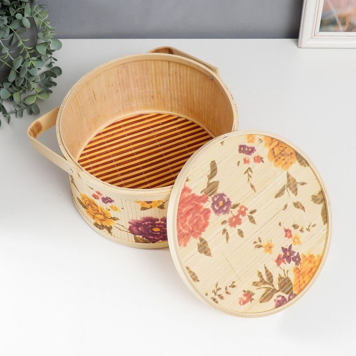 Шкатулка бамбук "Сад с пионами" круглая, с ручками 16х26х26 см