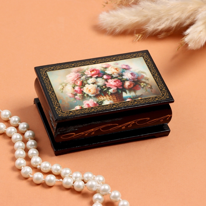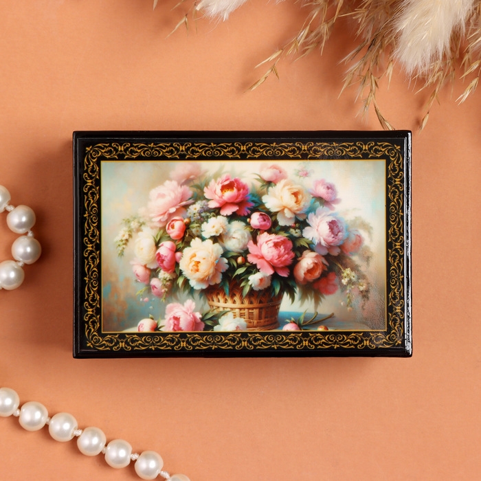 Шкатулка «Букет пионов в корзине», черная, 6×9 см, лаковая миниатюра