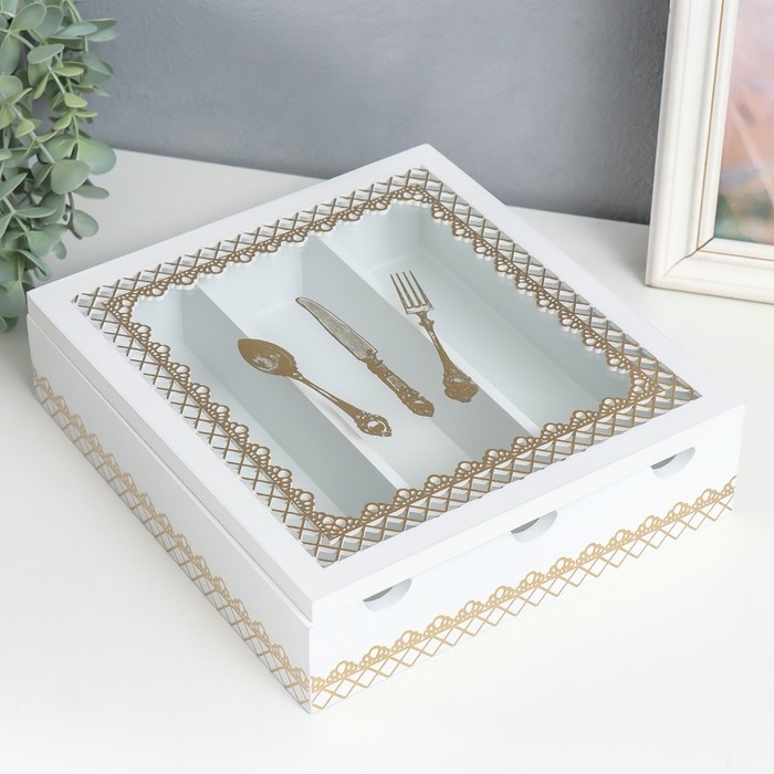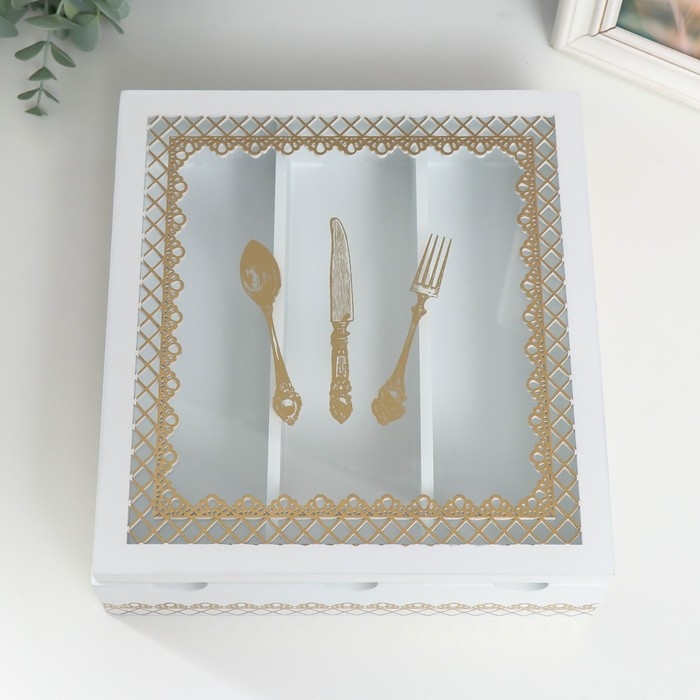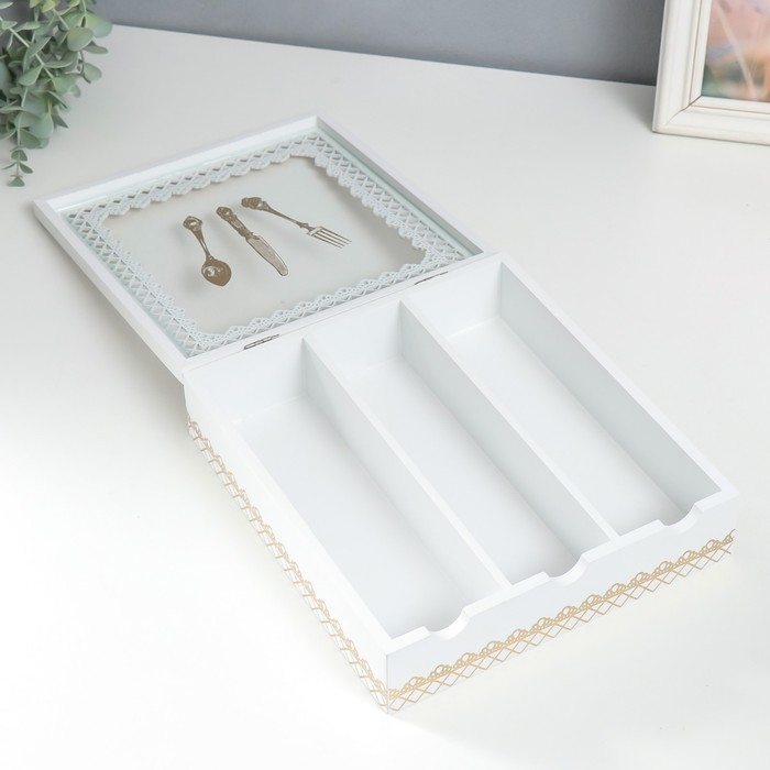 Шкатулка дерево с делениями "Столовые предметы" белая с золотом 26х24х6,8 см