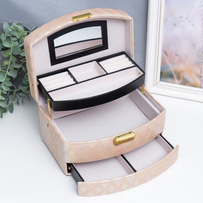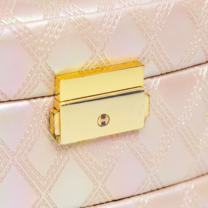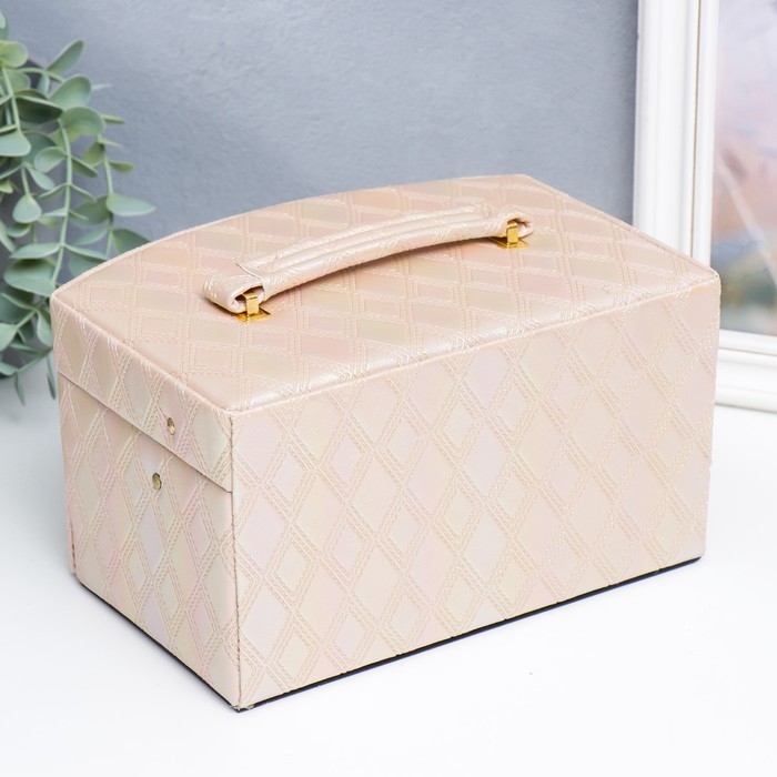 Шкатулка кожзам для украшений сундук "Сеть из ромбов. Сливочный перламутр" 13х16х23 см