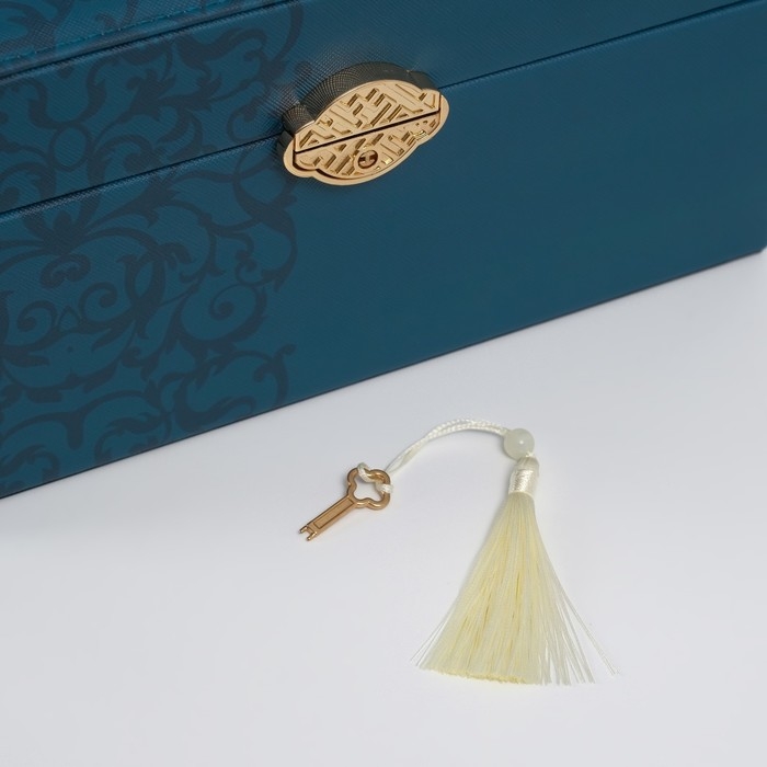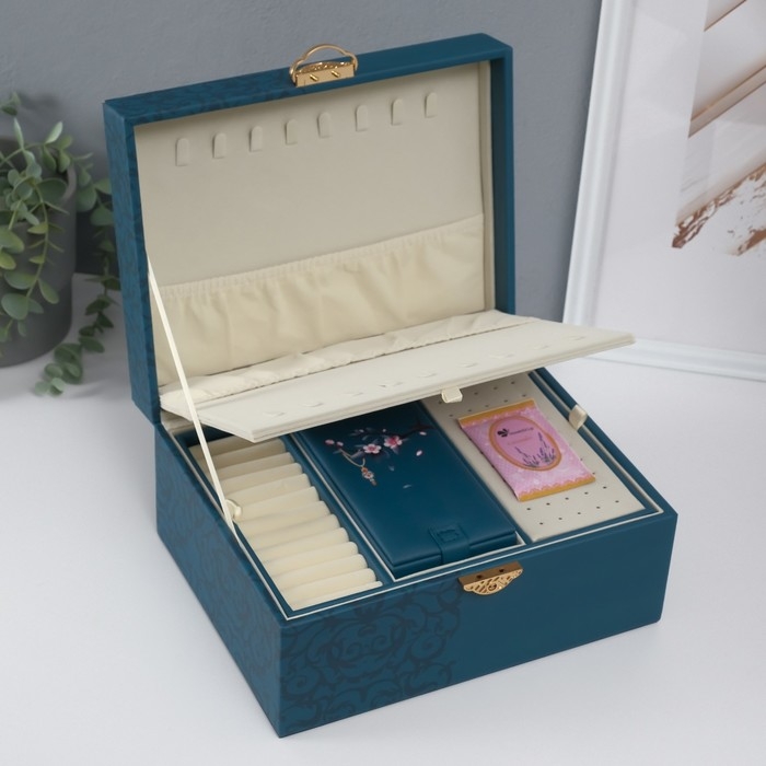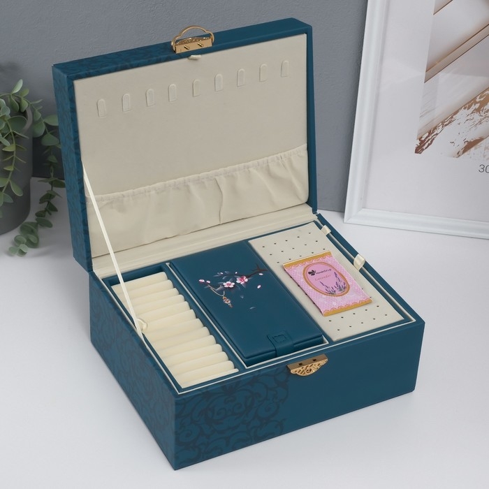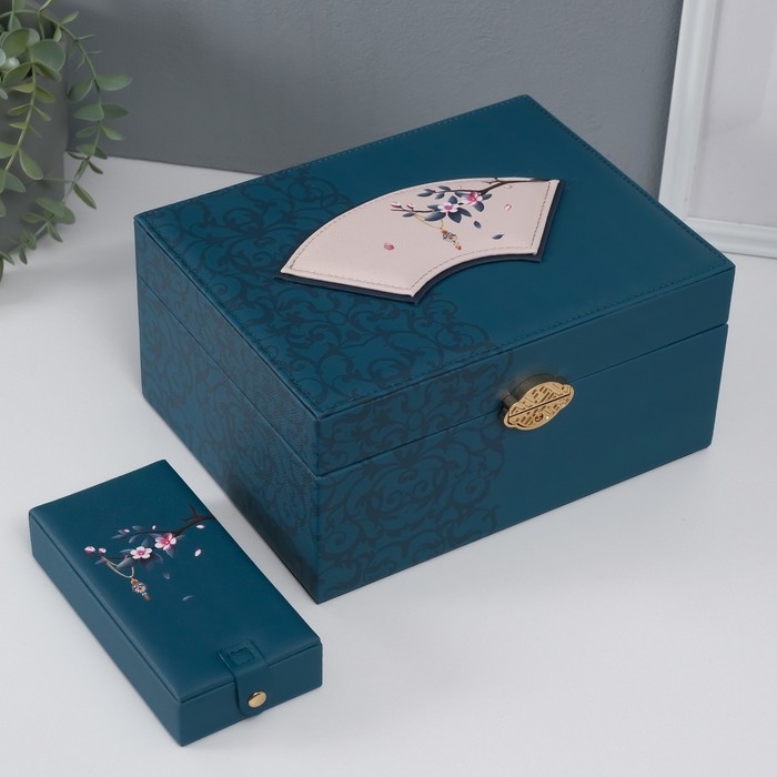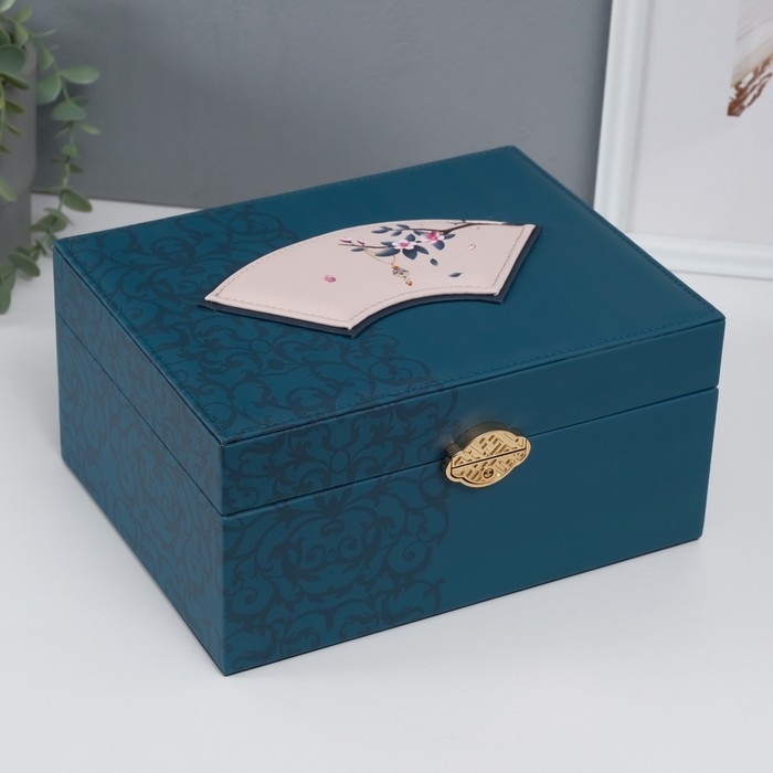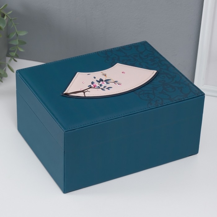 Шкатулка кожзам для украшений сундук"Кулон на сакуре. Узоры" синяя" 26х20х13 см