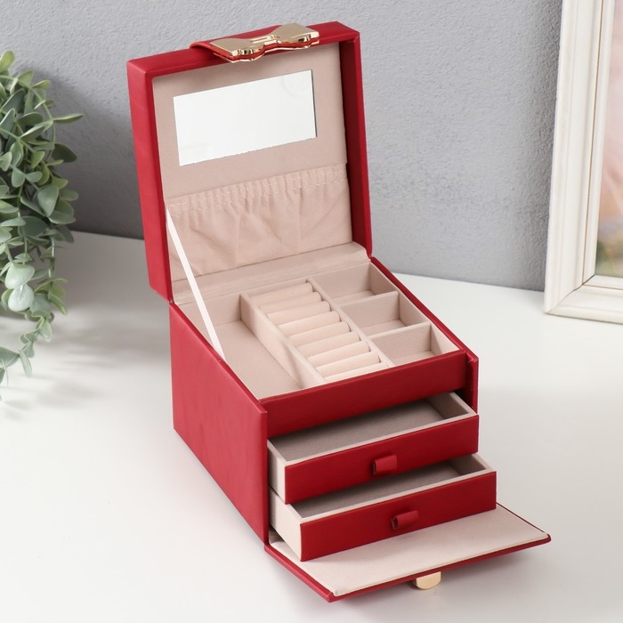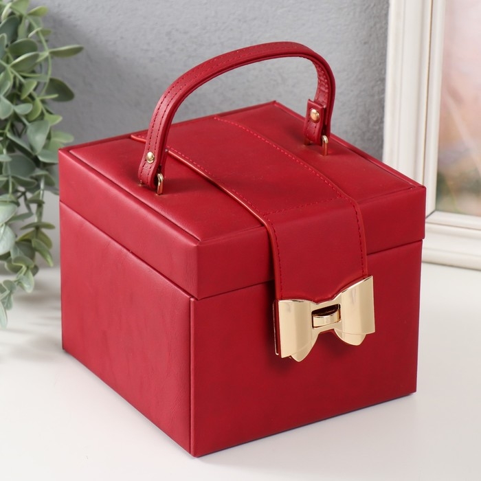 Шкатулка кожзам для украшений "Золотой бантик" красная 15х15х12,7 см