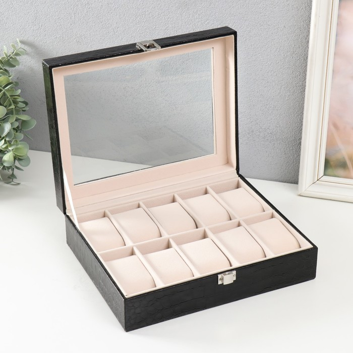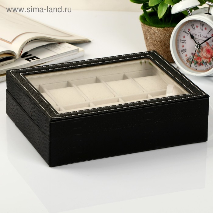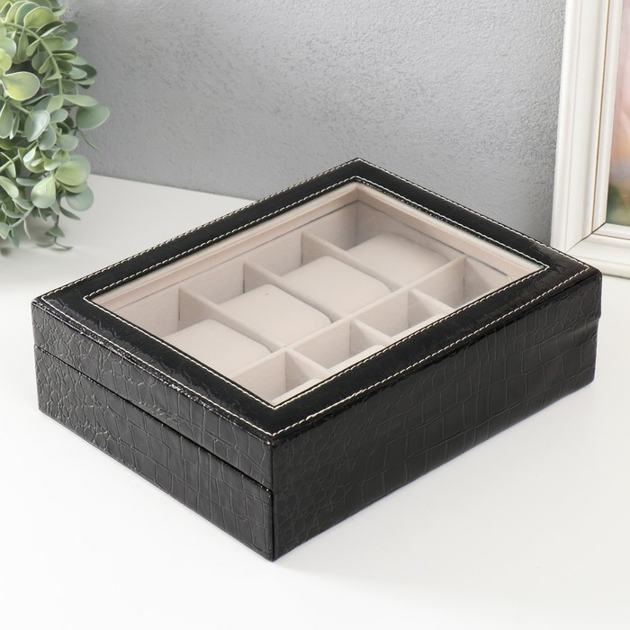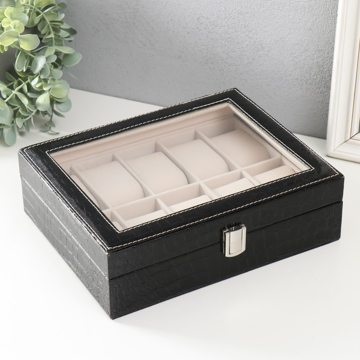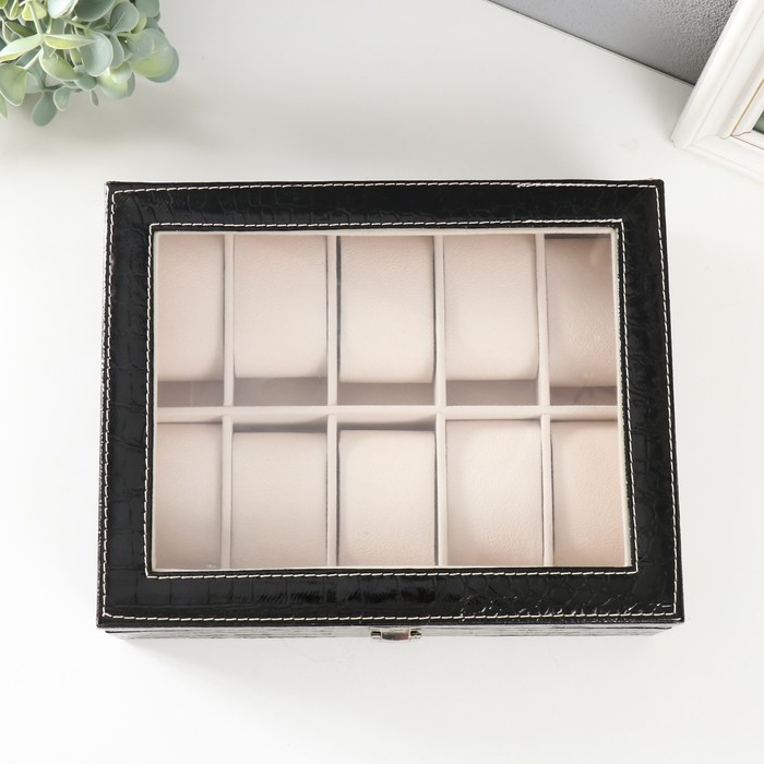 Шкатулка кожзам под часы 10 отделений "Питон чёрный с белой строчкой" 7,5х25,5х20 см