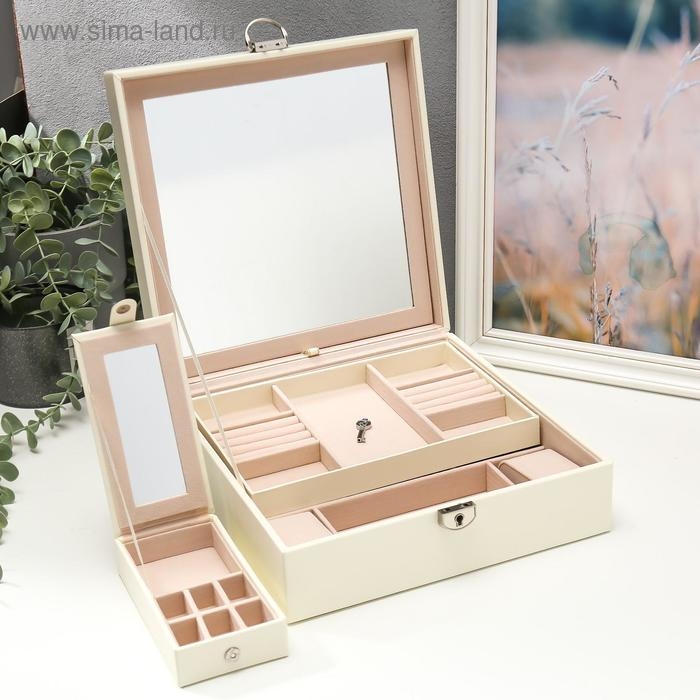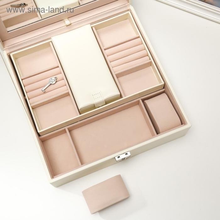 Она снабжена отделениями, которые предназначены для разных украшений: колец, браслетов, часов, колье, цепочек, серег. Изнутри шкатулка покрыта мягким материалом, а снаружи — искусственной кожей, эффектной и качественной.