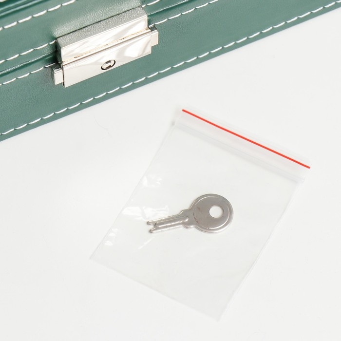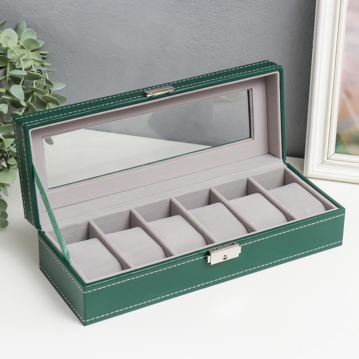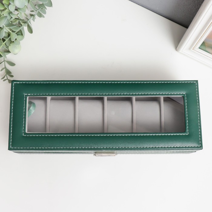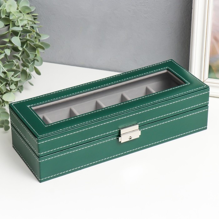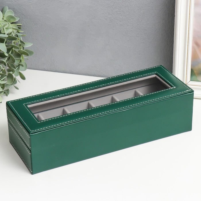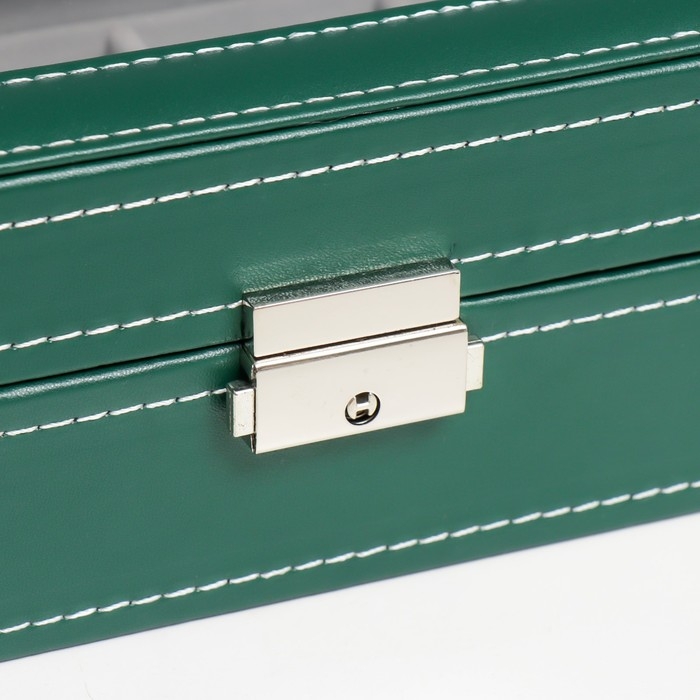 Шкатулка кожзам под часы 6 отделений "Зелёная с белой строчкой" 8х30х11 см