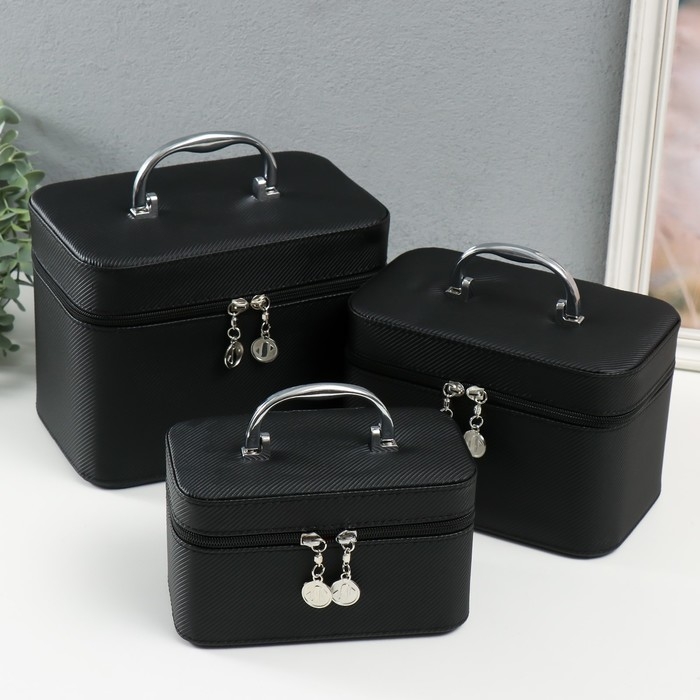 Шкатулка кожзам с зеркалом "Штрих.Чёрный" набор 3 шт 21х13,5х13;18,5х10,5х10;16,5х15х23 см